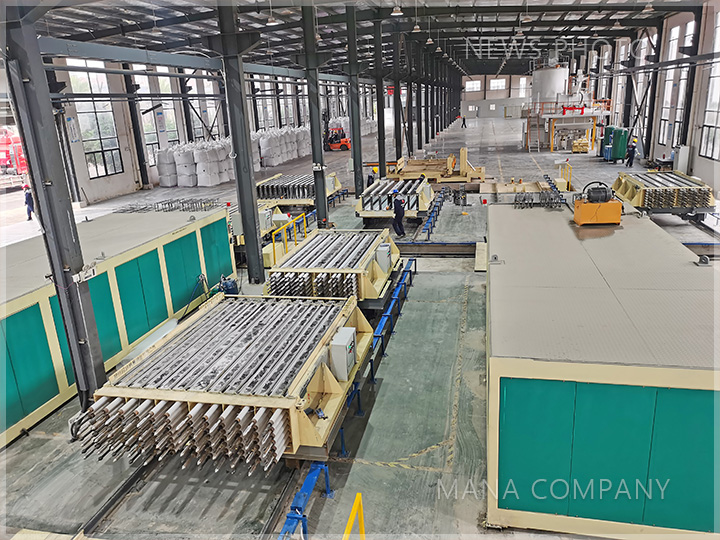 瑪納M30型石膏墻板生產線配備整體自動抽穿心機、自動推板機、上壓成型機、專用攪拌系統、自動清理機、自動噴涂機、自動出板機、擺渡車等等的重要設備,功能齊全,工人勞動強度低,實現產能高。
